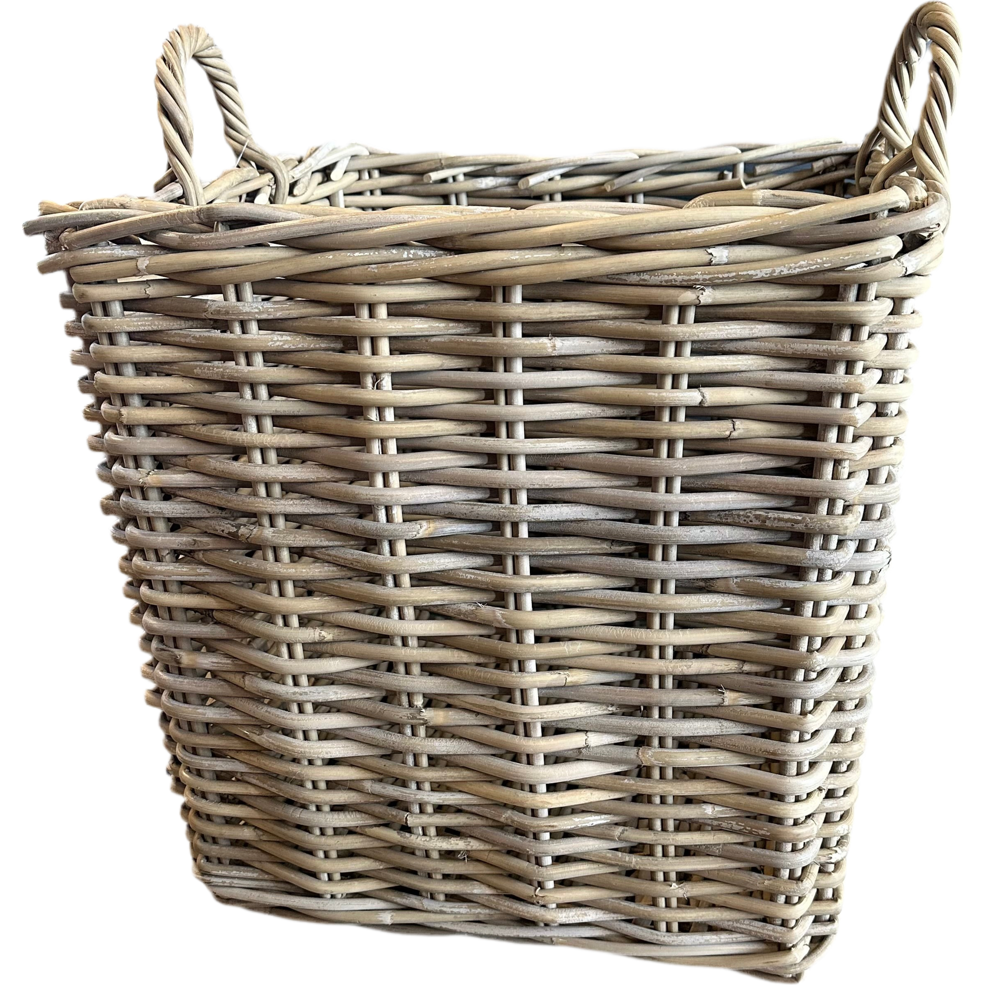 Denna fyrkantiga korg i grå rotting är både stabil och vacker – handflätad i naturmaterial med något tunnare men stadig tråd. Den generösa storleken gör den idealisk för förvaring av ved, filtar eller som en dekorativ detalj i uterum, hall eller vardagsrum.