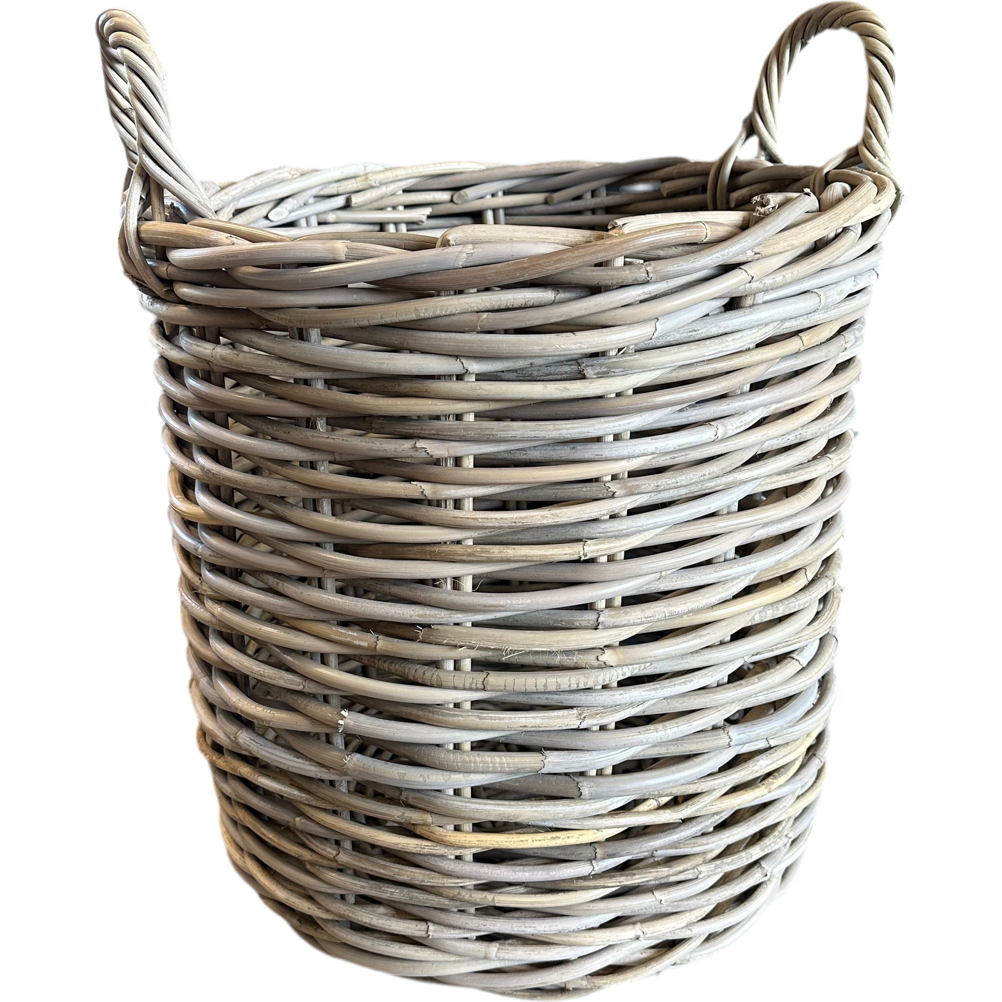 Denna stora runda korg i grå rotting är både funktionell och vacker – tillverkad för hand med en något tunnare men stadig tråd som ger ett elegant och levande intryck. Den neutrala grå färgen passar perfekt i både moderna och lantliga miljöer, och korgen fungerar utmärkt som vedkorg, förvaring eller planteringskorg under tak.
