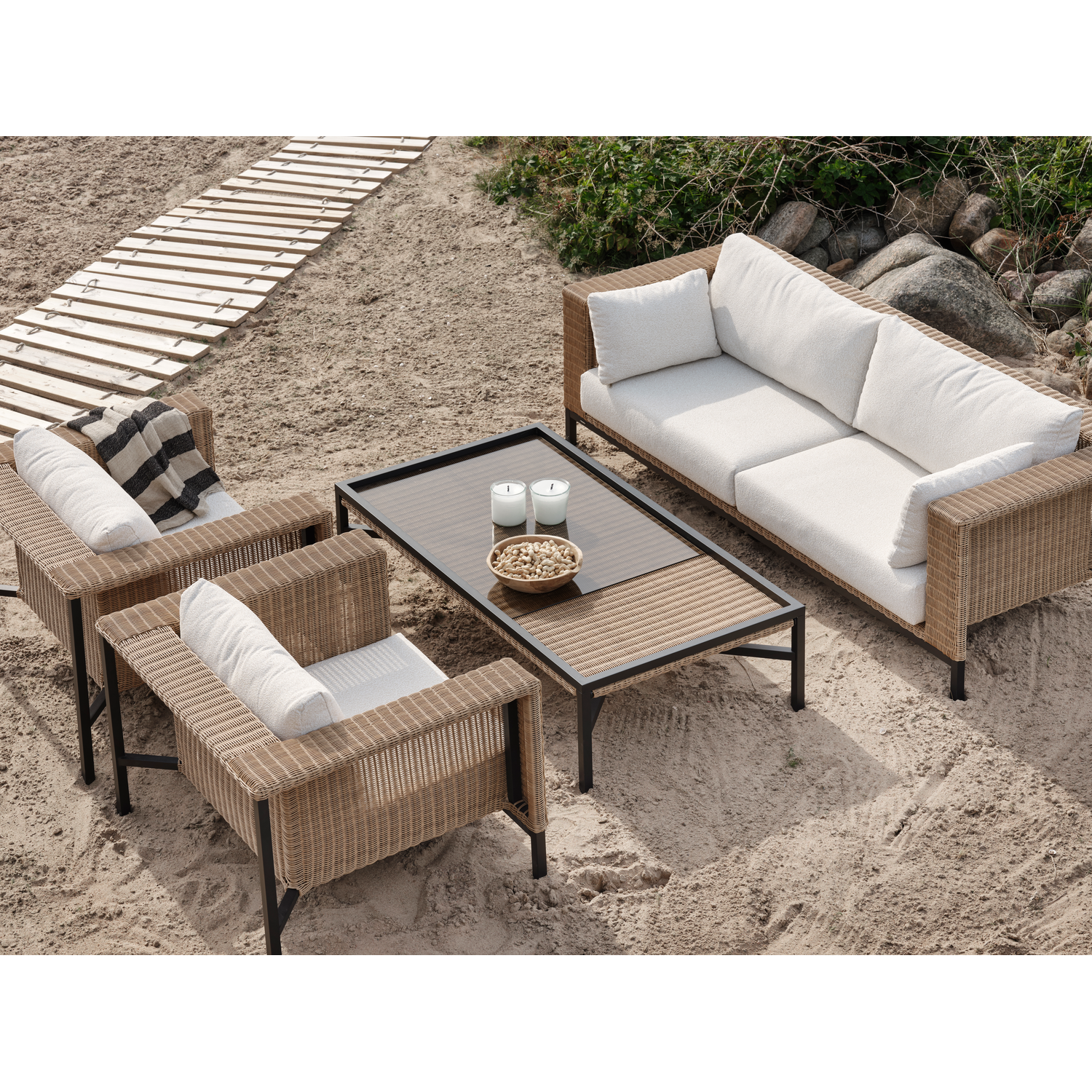 Shell är en exklusiv loungeserie från Brafab med rustik känsla och moderna linjer. Den här kompletta gruppen består av två fåtöljer, en generös 2,5-sitssoffa och ett svartlackerat soffbord – ett perfekt set för dig som vill skapa en stilren och inbjudande utomhusmiljö.